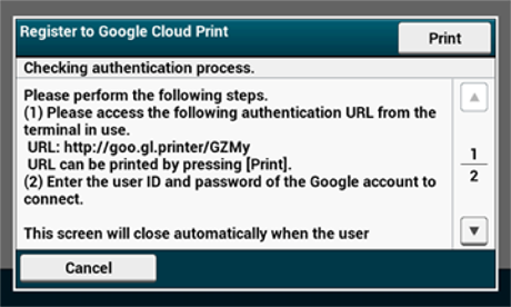 Tryk på [Print (Udskriv)] hvorefter autoriserings-destinationens URL udskrives.