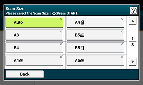 Hvis maskinen ikke kan registrere dokumentstørrelsen med scanningsstørrelsens indstilling indstillet til [Auto (Auto)], vil scanningsstørrelses-skærmen vises, når der trykkes på knappen.