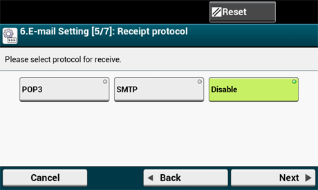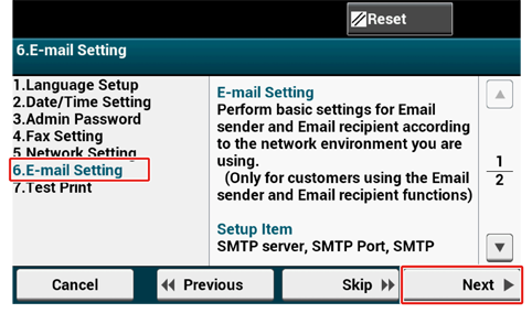 Tarkista että [6. E-mail Setting (6. Sähköpostiasetus)] -näyttö on näkyvillä, ja paina sitten [Next (Seuraava)].
