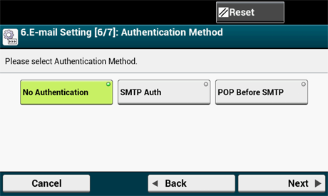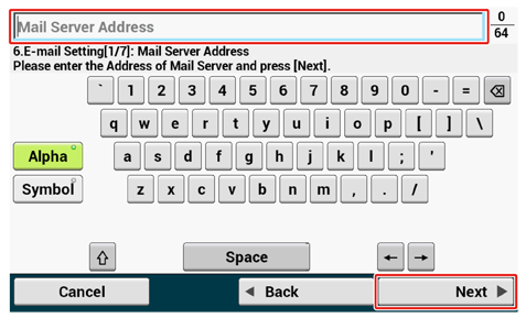 Syötä postipalvelimen osoite ja paina [Next (Seuraava)] kosketuspaneelissa.
