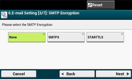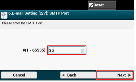 Käytä numeronäppäintä käyttöpaneelissa syöttääksesi SMTP-portin ja paina [Next (Seuraava)].