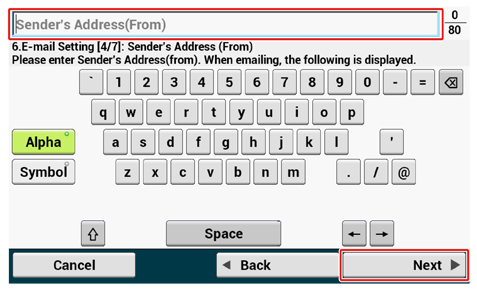 Syötä lähettäjän osoite ja paina [Next (Seuraava)] kosketuspaneeliin.