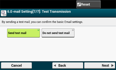 Jos et halua käyttää toimintoja, jotka vaativat sähköpostiasetuksia, paina [Skip>> (Ohita>>)] ja siirry kohtaan Testitulostus.