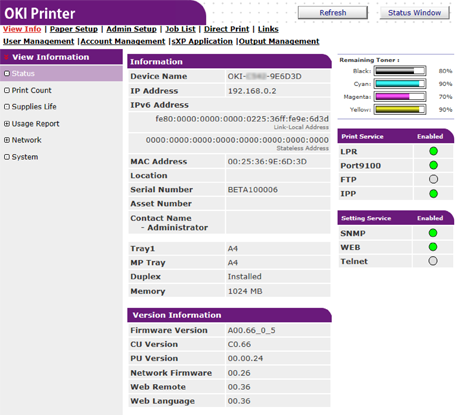 Näyttää laitteen nykyisen tilan. Kaikki laitteella ilmentyneet varoitukset ja virheet näytetään "Hälytystietona". Voit myös tarkastaa jokaisen verkkopalvelun toimintatilan, laitetietoluettelon sekä laitteeseen asetetun IP-osoitteen. |