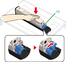Käännä väriainekasetin lukitusvipua (sininen) (10) taaksepäin kunnes sen yläosa linjautuu
