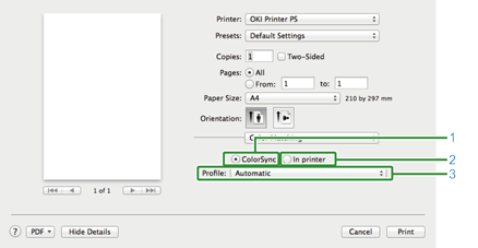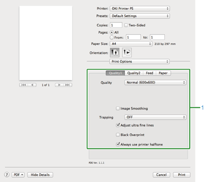 Anger utskriftskvalitet, tonerbesparing, papperstyp etc. |