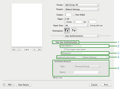 [Authentication type (Autentiseringstyp)], [Summary Account (Totala Kontot)] kan aktiveras från Apple-menyn, välj [System Preferences (Systeminställningar)] > [Printers & Scanners (Skrivare & Skannrar)], välj enheten och aktivera enheten i fliken [Options (Alternativ)] i [Options & Supplies (Alternativ och tillbehör)].
