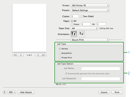 Anger utskriftstyp. [Job Type Option (Jobbtypsalternativ)] kan användas om [Secure as Shared Job (Spara som delat jobb] eller [Private Print (Privat utskrift] väljs. |