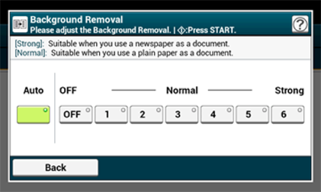 Om du väljer [Auto], är bakgrunden automatiskt bort i en nivå som passar dokumentet.