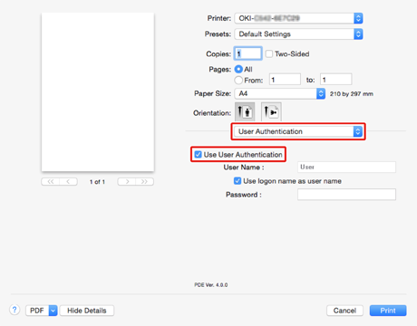 Auto: Följer inloggningsmetoden till Mac När användaren har loggat in på domänen används [Server LDAP (LDAP-server)], och när användaren inte loggat in på domänen används [Device Local (Lokal enhet)] som autentiseringsmetod.