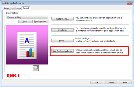 Standardautentiseringstypen kan ställas in i [User Authentication Options... (Användarautentiseringsalternativ)] i fliken [Device Options (Enhetsalternativ)].