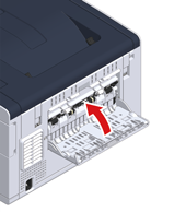 Om papper fastnar i fixeringsenheten, tryck ner pappersstoppsspaken på fixeringsenheten och dra långsamt ut det fastklämda pappret mot dig.