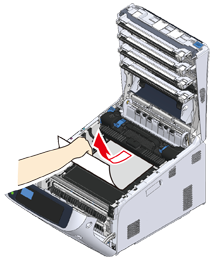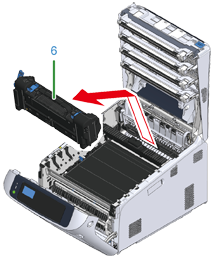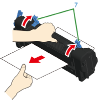 Lyft upp öppningsspakarna (7) på fixeringsenheten och dra försiktigt ut det fastklämda papperet framåt.