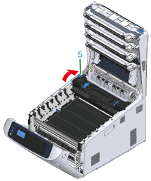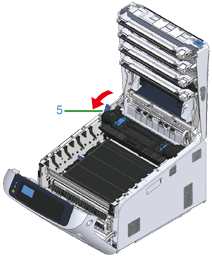 Lyft upp den vänstra öppningsspaken (5) på fixeringsenheten framåt.