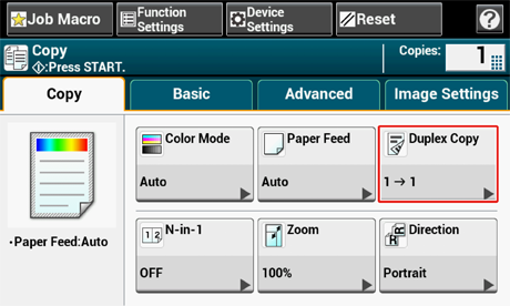Nyomja meg a [Kétoldalas másolat] lehetőséget a [Másolás] vagy [Alapbeállítások] lapon.