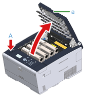 Stiskněte tlačítko (A) a výstupní zásobník (a) otevřete a na doraz.