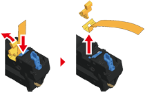 Stiskněte modrou páčku na fixační jednotce a vyjměte oranovou bezpečnostní zaráku a fólii.