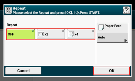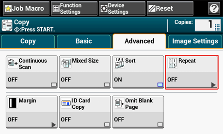 Bu işlev, tek bir kağıt sayfasının bir yüzüne arka arkaya aynı belgeyi kopyalamanıza olanak sağlar. Belge iki veya dört sefer tekrarlanabilir.