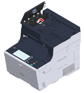 Belge tepsisinin (c) altına sıkışmış belgenin kenarı görünebiliyorsa, belge tepsisini kaldırın ve belgeyi çıkarmak için yavaşça dışarı çekin.