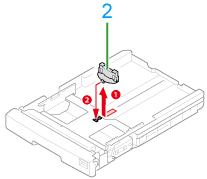 Όταν φορτώνετε χαρτί μεγέθους A6, μετακινήστε τον αναστολέα χαρτιού (2) προς τα μπροστά και αφαιρέστε το μία φορά, μετά εγκαταστήστε το στο μεταλλικό τμήμα. Σύρετε το στήριγμα χαρτιού προς την κατεύθυνση του βέλους και σταθεροποιήστε το.