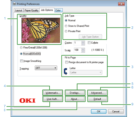 Καθορίζει τον τύπο εργασίας και τον αριθμό αντιγράφων που θέλετε να εκτυπώσετε.Το [Job Type Option (Επιλογή Τύπου Εργασίας)] μπορεί να χρησιμοποιηθεί αν έχει επιλεχθεί [Store to Shared (Αποθήκευση ως Κοινόχρηστη Εργασία)] ή [Private Print (Ιδιωτική Εκτύπωση)].Αν επιλέξετε το πλαίσιο ελέγχου [Collate (Συρραφή)], εκτυπώνονται πολλαπλά έγγραφα σε μονάδες αντιγράφων. |