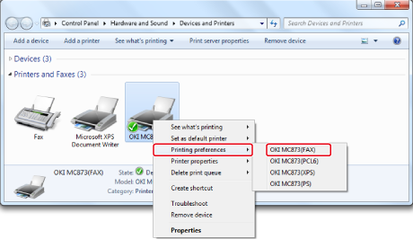 Clique com o botão direito do mouse no ícone OKI MC873 e selecione [Preferências de impressão] > [OKI MC873(FAX)].