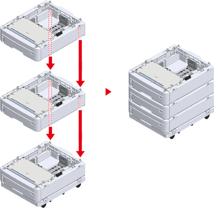 将底层扩展纸盒的背面与要安装的扩展纸盒背面的突出部分对齐,然后轻轻将它们堆叠上去。