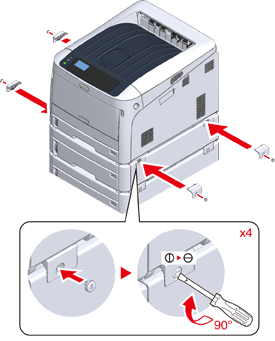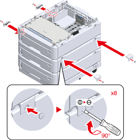 最多可以安装四个扩展纸盒。 安装三个或以上扩展纸盒时,请安装选购的角轮基座以防止翻倒,并将翻倒防护工具设置到位。