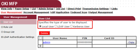 LDAP 사용자: LDAP 서버에 등록된 사용자. LDAP 서버 인증 설정이 필요합니다. LDAP 사용자를 등록할 수 없습니다. 사용자를 보는 것만 가능합니다. 기기를 사용한 사용자를 확인할 수 있습니다.