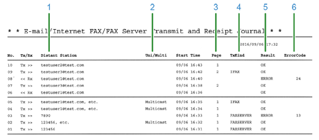 이 절에서는 송신 및 수신 저널 보고서의 항목(이메일/인터넷 팩스/팩스 서버)를 설명합니다.