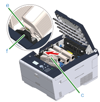 토너 카트리지와 이미지 드럼 컬러 레이블이 정렬되도록 왼쪽 함몰부(e)를 이미지 드럼의 돌출부(f)와 정렬하여 새 토너 카트리지(c)를 장착합니다. 그런 다음 오른쪽을 살짝 위치에 삽입합니다.