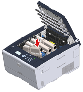 토너 카트리지를 이미지 드럼에 설치할 때 청색 레버를 돌리지 않고 배출 트레이를 닫으면, 오작동을 일으킬 수 있습니다. 청색 레버의 상단이 토너 카트리지 뒤쪽에 있는 돌출부에 맞을 때까지 청색 레버를 돌려야 합니다.