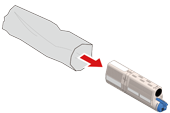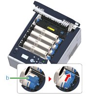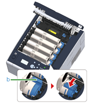 토너 카트리지 청색 레버(b)의 끝부분을 집어내고 이것이 카트리지 돌출부에 맞을 때까지 사용자 쪽으로 돌립니다.