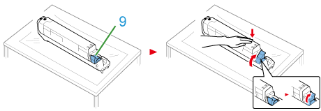 從包裝袋中取出新的感光鼓,並放在平坦表面上。