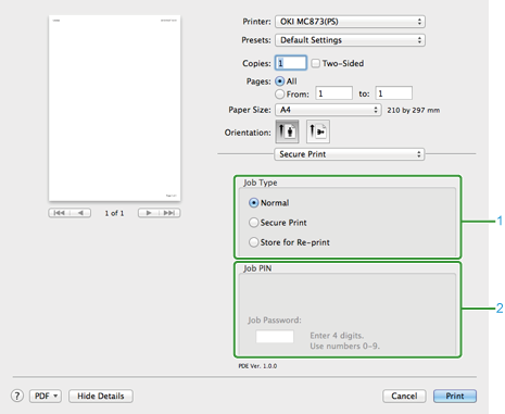 指定作業類型。[JOB PIN (作業 PIN)] 可在選擇 [Secure Print (安全列印)] 或 [Store for Re-print (儲存起來再列印)] 時使用。 |