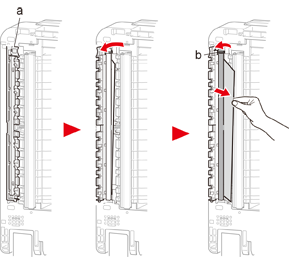 如果在文件壓板中找不到文件,請循箭頭方向開啟導紙板 (a),並且順時針轉動轉盤 (b) 以取出文件。如果轉動轉盤 (b) 無法取出文件,請緩慢拉出文件。