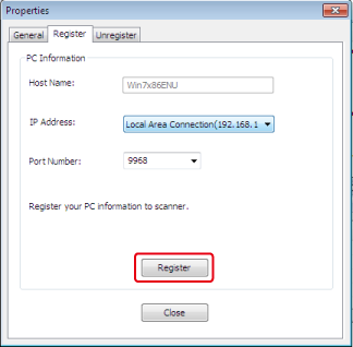 從 [Scan Settings (掃描設定)] 對話方塊中選擇此機器,按一下 [Register (登錄)],在 [Register host address (登錄主機位址)] 中登錄 [Name (名稱)] 與 [Host (主機)],然後按一下 [OK (確定)]。