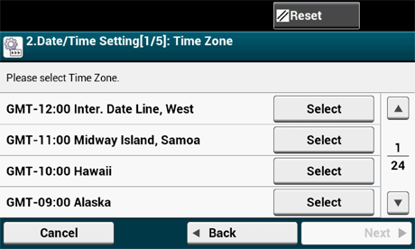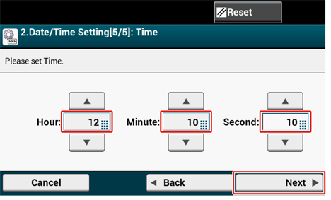 ] 或操作面板的數字鍵盤,按照輸入日期的方式輸入目前時間,然後按下 [Next (下一步)]。設定值隨即更新。