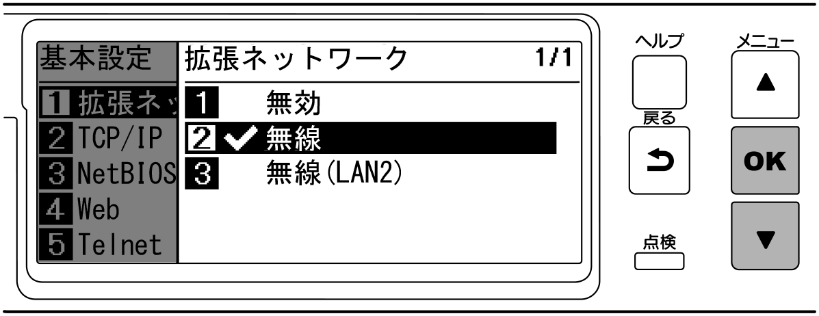 - 無線(インフラストラクチャ)を[無効]に設定した後に、無線(APモード)を有効にするかを確認する画面が表示された場合は、《OK》を押して、無線(APモード)を有効にしてください。