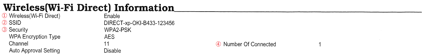 はじめにNetwork Informationを印刷して、Wireless(AP Mode) Informationで下図の①から④の番号の項目を確認しながら、次の説明を確認してください。