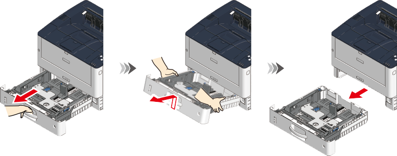用紙カセットの取っ手を持って止まるまで引き出し、用紙カセットの側面に持ち替えて少し上げて引き抜きます。