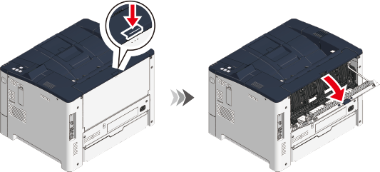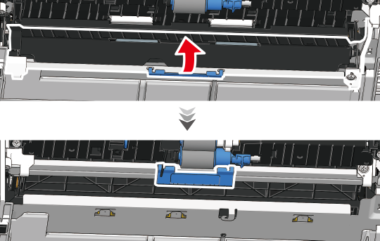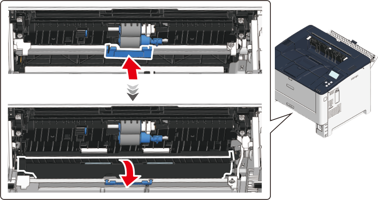 用紙カセットを抜いた装置内部の青いレバーを上に押してロックを外し、カバーを開けます。