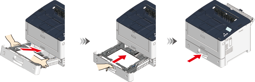 用紙が見えない場合は、トレイ1の用紙カセットの取っ手を持って止まるまで引き出し、用紙カセットの側面に持ち替えて少し上げて引き抜きます。