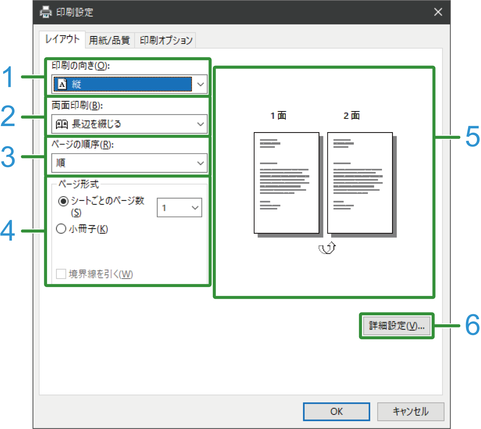 4 | ページ形式 | 1枚の用紙に印刷するページ数と小冊子印刷を指定します。 |