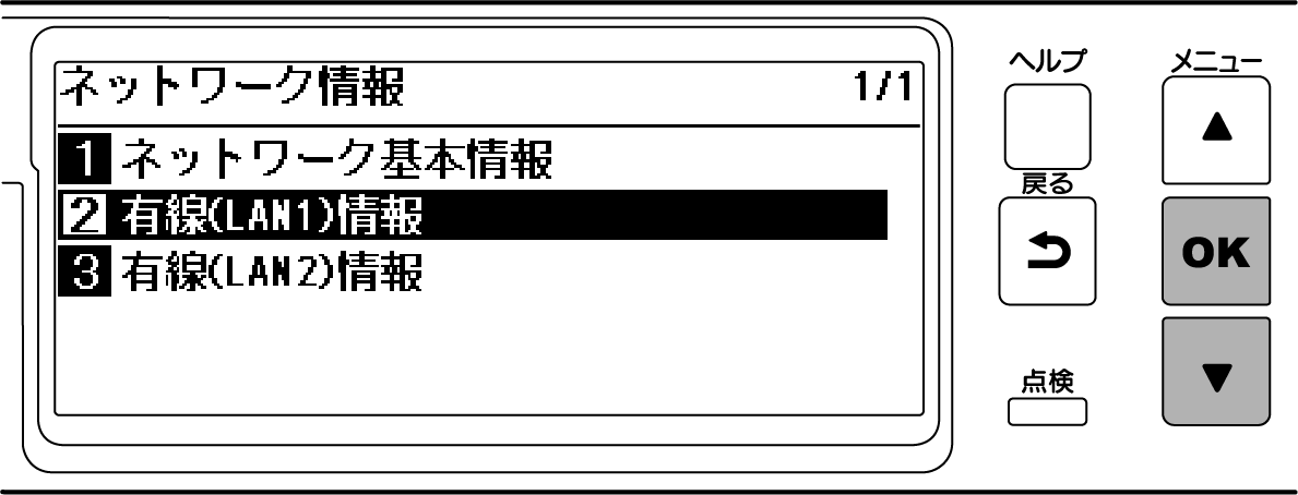 ▼を押して、[有線(LAN1)情報]を選択し、《OK》を押します。