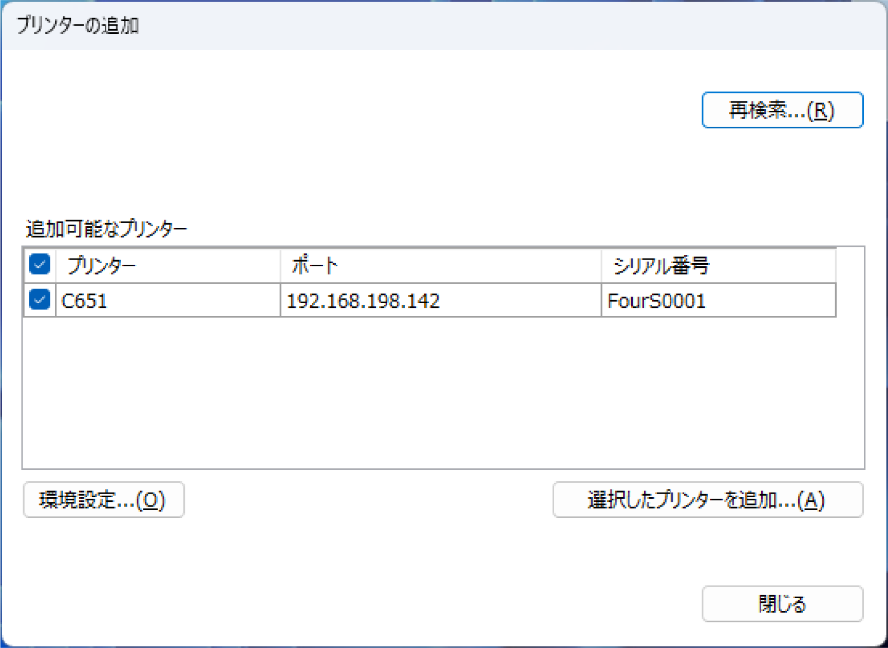 検出したプリンターを選択し、[選択したプリンターを追加]をクリックします。