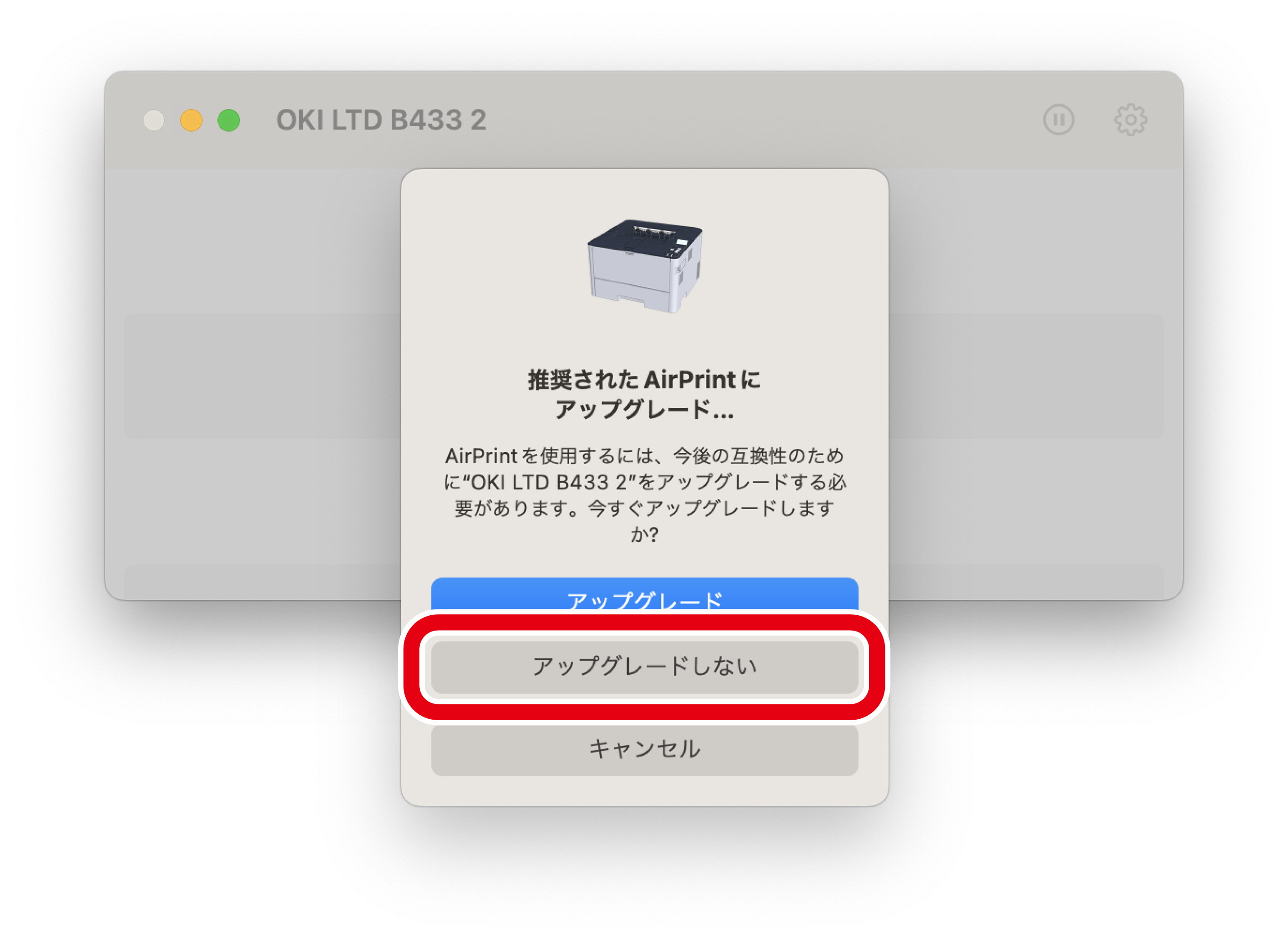 - [推奨されたAirPrintにアップグレード...]が表示された場合は、[アップグレードしない]をクリックします。