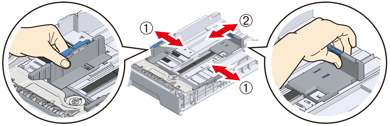 Slide the paper guide and the blue part of the paper stopper to fit the size of the paper to be loaded.