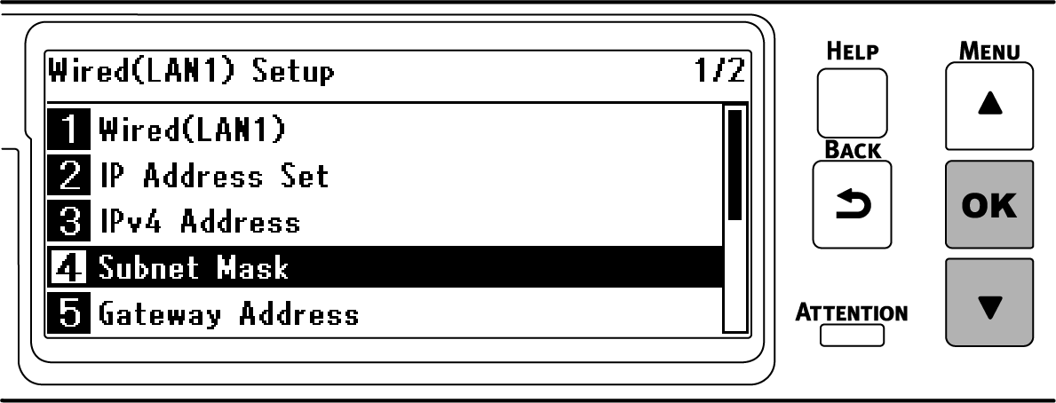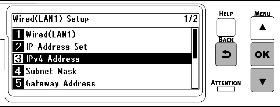 Press «BACK», then press ▼ to select [IPv4 Address] on the [Wired(LAN1) Setup] screen, and finally press «OK».