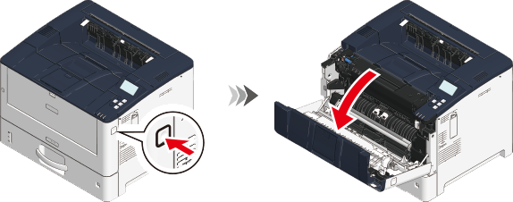 Press the front cover open button on the side of this machine, and then open the front cover toward you.